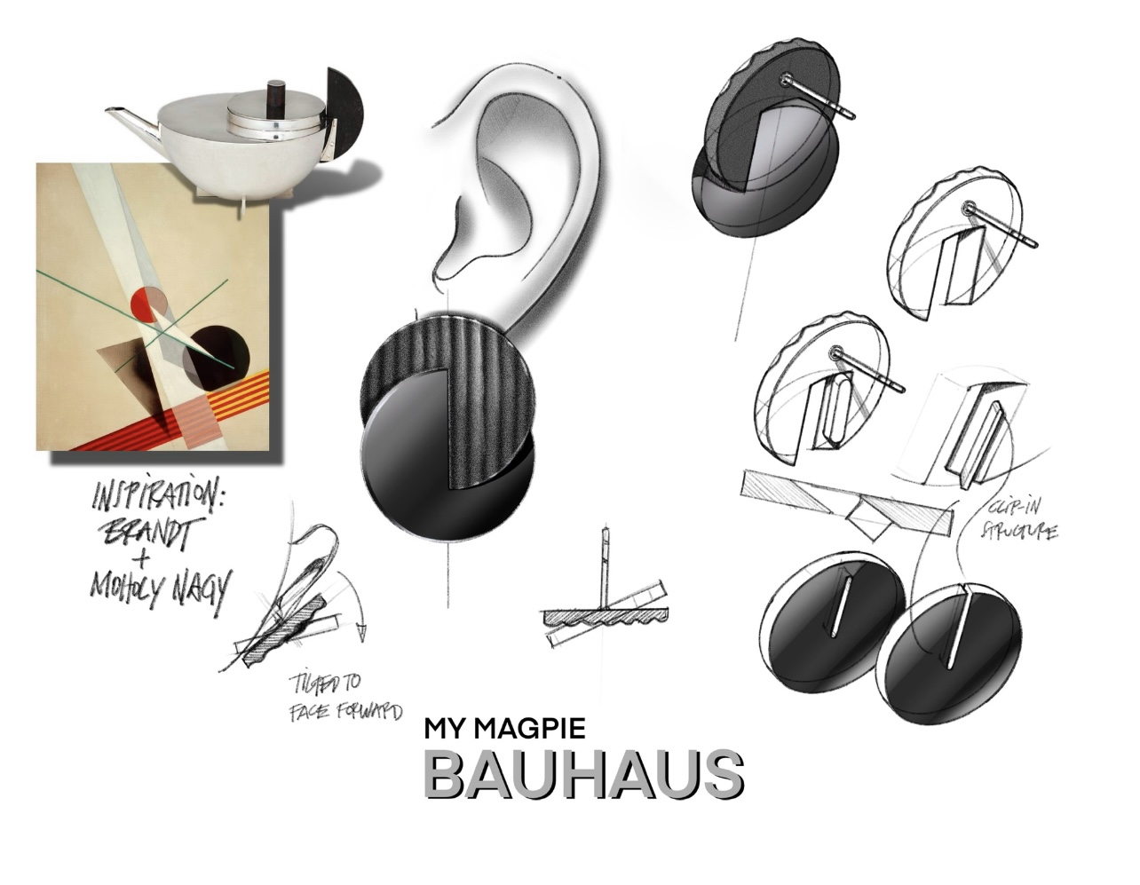 Das Design von Marianne spielt gekonnt mit Gegensätzen: Hier greifen glatte und strukturierte Formen ineinander. Die symmetrischen Kreise erzeugen ein harmonisches Gesamtbild, während die Kombination aus mattem und glänzendem Finish dem Schmuckstück eine faszinierende Tiefe verleiht. Jedes Detail wurde durchdacht, um die zeitlose Eleganz der Bauhaus-Bewegung widerzuspiegeln und gleichzeitig moderne Bedürfnisse nach Nachhaltigkeit zu berücksichtigen.